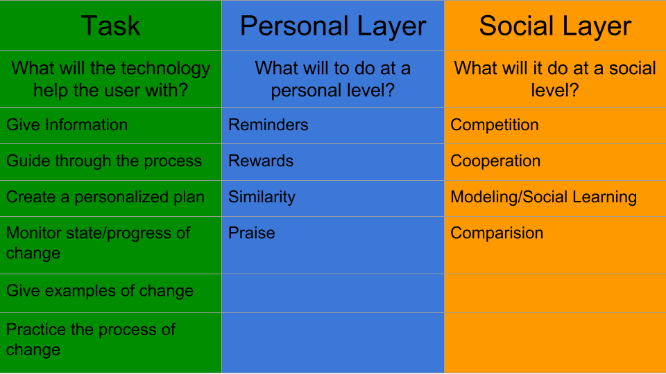 Oinas-Kukkonen, H., Hasle, P., Harjumaa, M., Segerståhl, K., & Øhrstrøm, P. (2008). A Systematic Framework for Designing and Evaluating Persuasive Systems. Lecture Notes in Computer Science, 164–176. http://doi.org/10.1007/978-3-540-68504-3_15