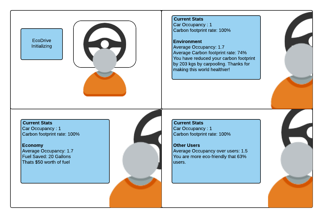- By assuming the regular occupancy of the car as 1, the amount of fuel saved, the amount of money saved and the reduction in carbon footprint can be calculated and displayed on the car dashboard.