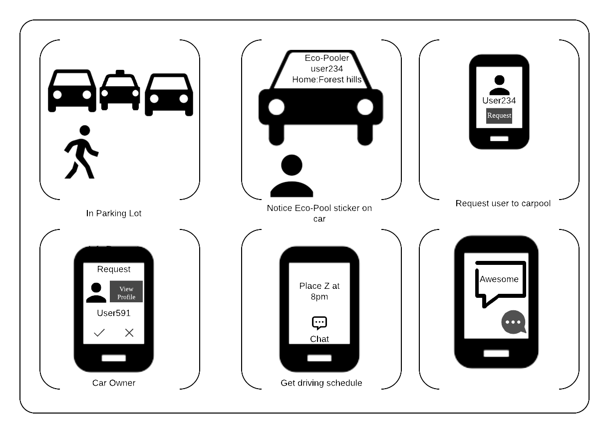 - She has multiple carpool buddies. One day her buddy has to stay at work late and updates situation on app. She requests other buddies for carpool.